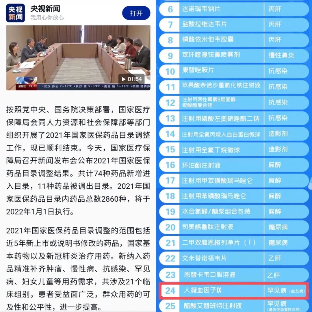 2021年12月3日,国家医疗保障局召开新闻发布会公布《2021年国家医保药品目录》,其中“人凝血因子Ⅸ”作为针对罕见病乙型血友病的治疗药品名列其中。这标志着泰邦生物集团下属山东泰邦生物制品有限公司历时七年、投入上亿元研发费用的“人凝血因子Ⅸ”,正式纳入国家医保药品目录。