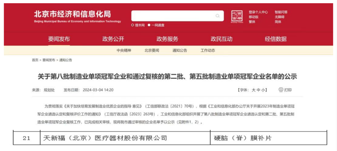 近日,国家工业和信息部公示了“2023年国家级制造业单项冠军企业”认定名单,泰邦生物集团旗下全资子公司-天新福(北京)医疗器材股份有限公司光荣上榜。此次入选代表国家层面对泰邦天新福脑脊膜产品的认可;标志着泰邦天新福生产工艺以及持续创新能力达到国际领先水平。